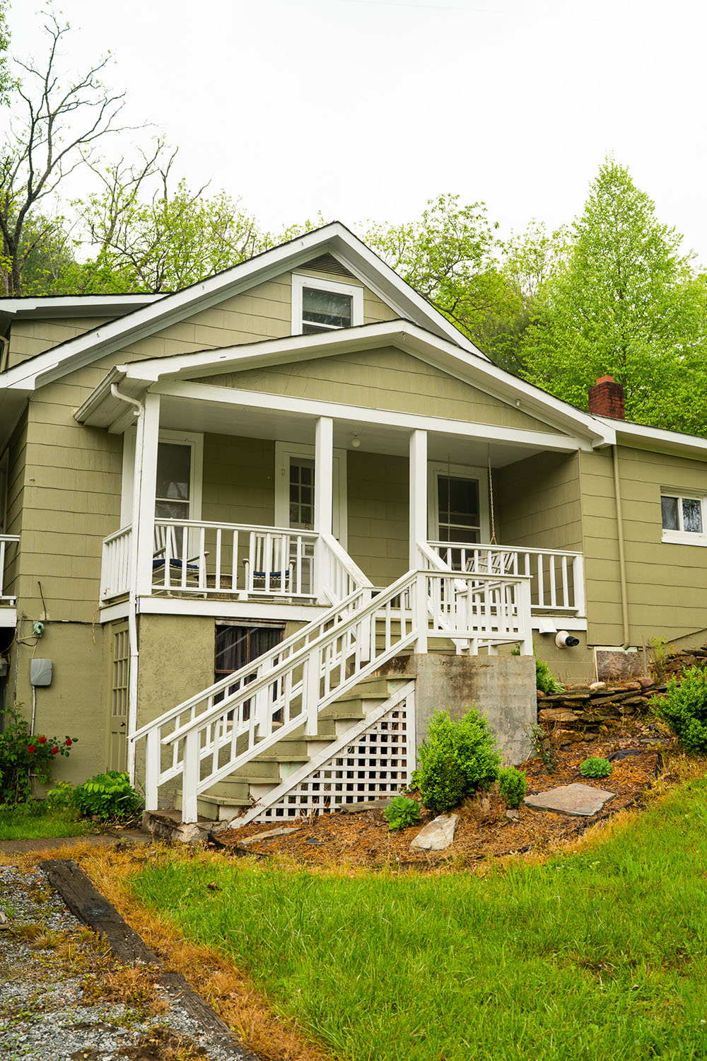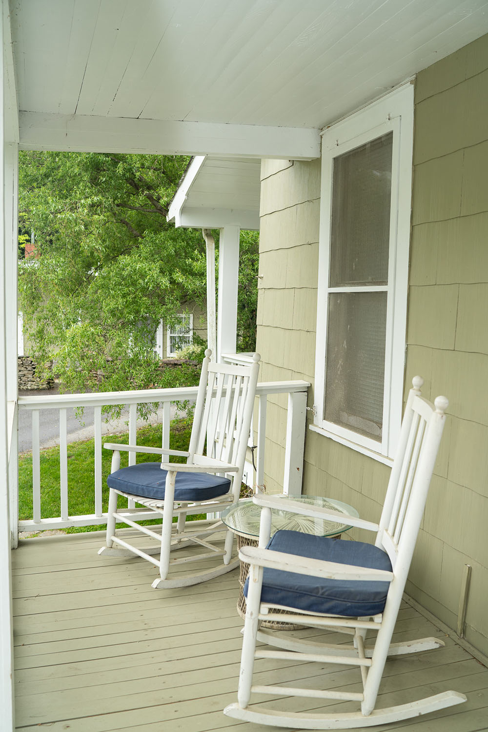 Room 5 is in the front of the Caretaker’s Cottage. Originally the living room, dining room and kitchen, it boasts three distinct spaces: living room/library, bedroom and bathroom. (Incidentally, if there are two or three couples, the living room can connect with Room 6 and/or 7.) Outside, the little private porch, complete with wi-fi, swing and rocking chairs, looks toward the New River. Wi-fi included.
